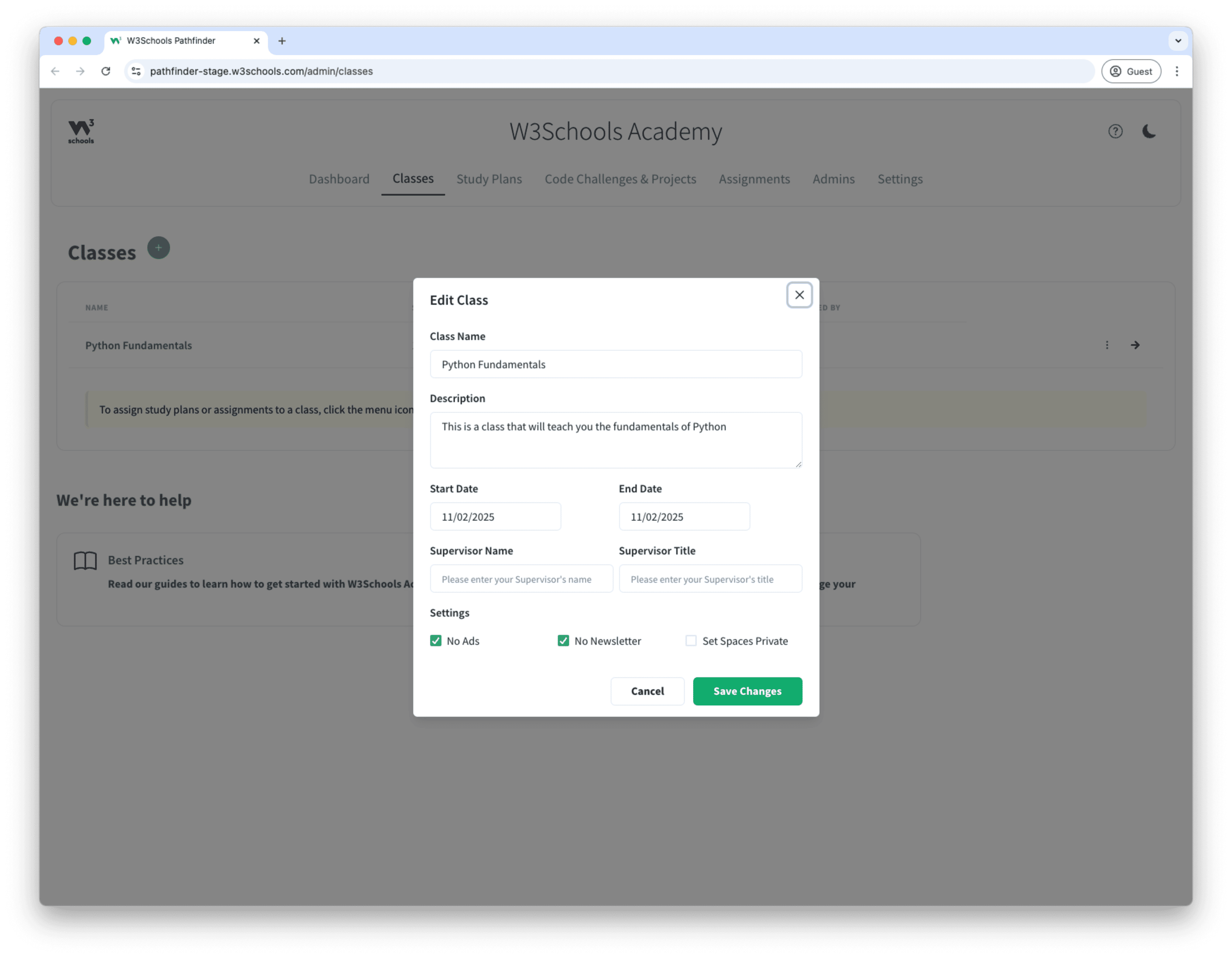 W3Schools Academy allows you to create classes.