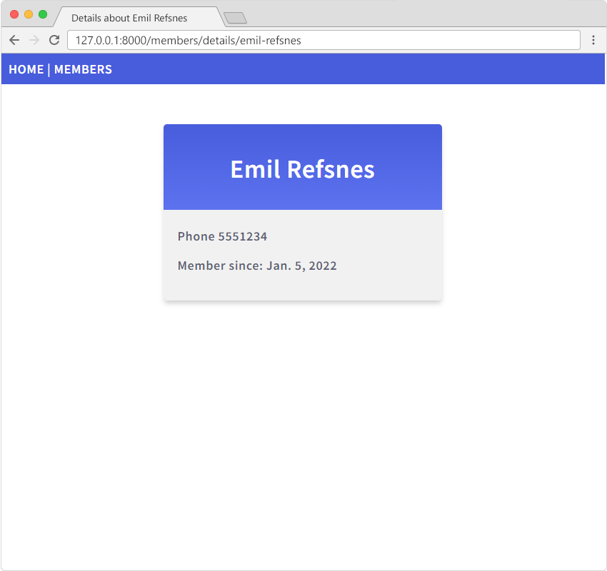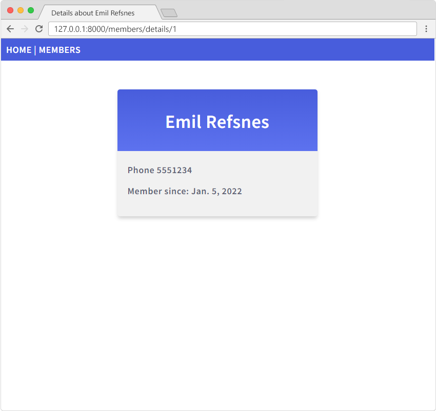 If you have followed all the steps on your own computer, you can see the result in your own browser: 127.0.0.1:8000/members/.