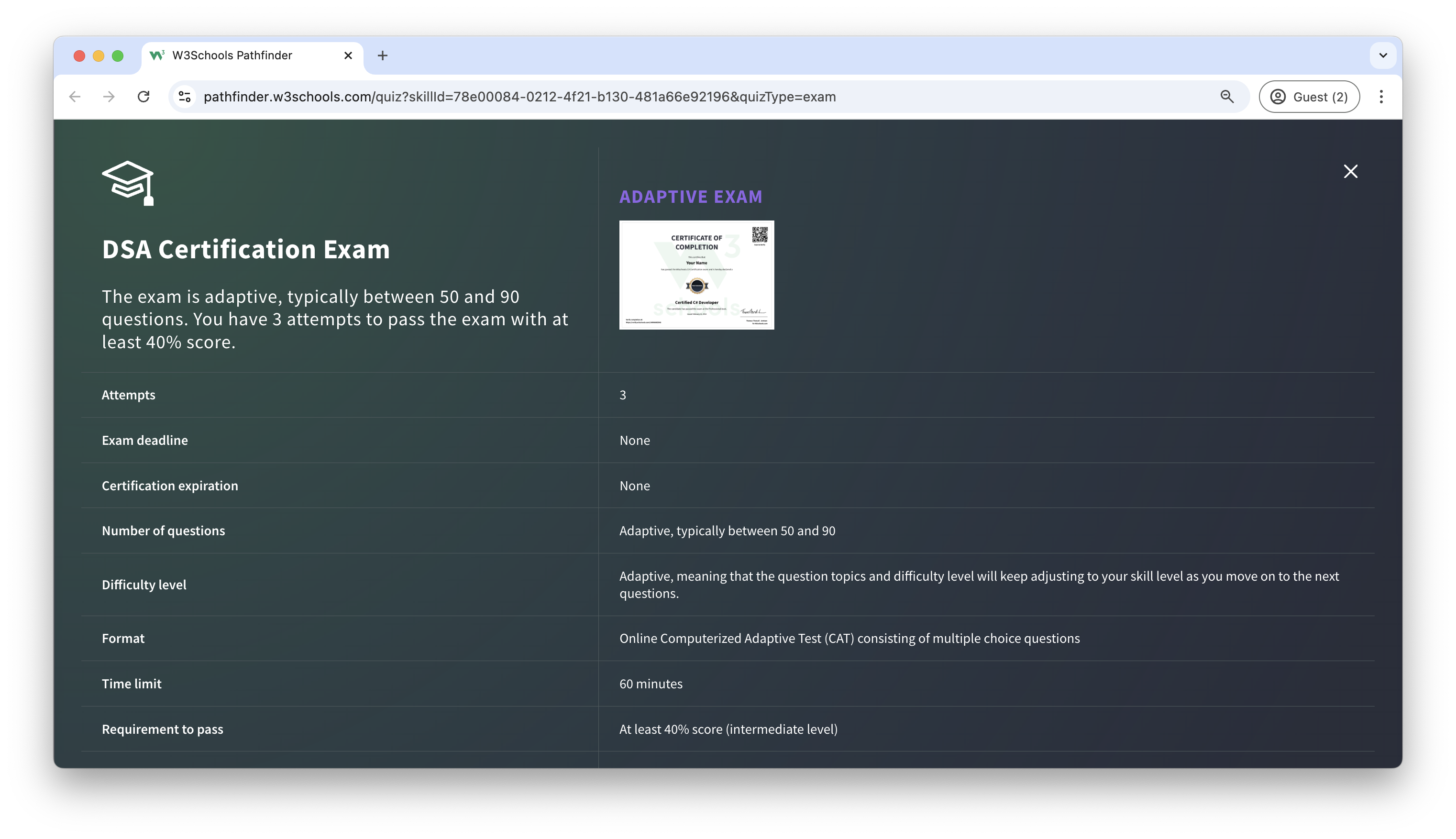 The DSA exam is a test that summarizes the W3Schools DSA syllabus.