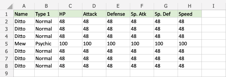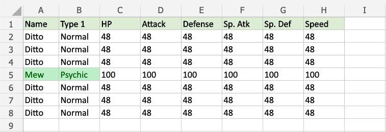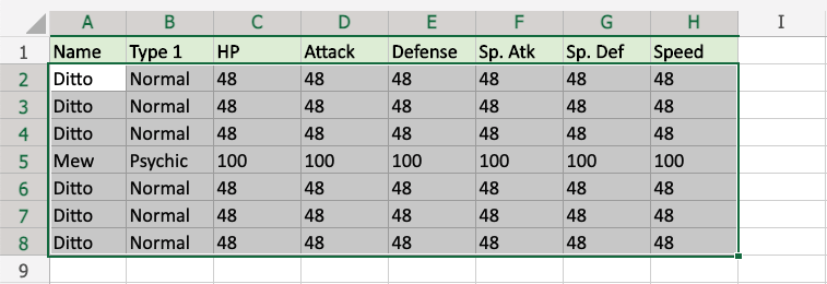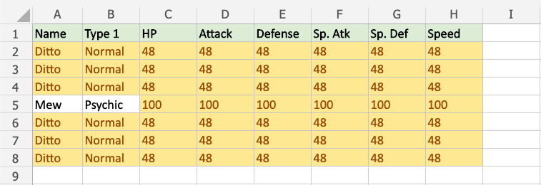 Mew and Psychic only appears once in the range, so these values are highlighted.