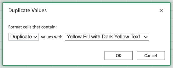 The "Duplicate Values..." Highlight Cell Rule will highlight a cell with one of the appearance options based on the cell value being the same as other cells in the range.