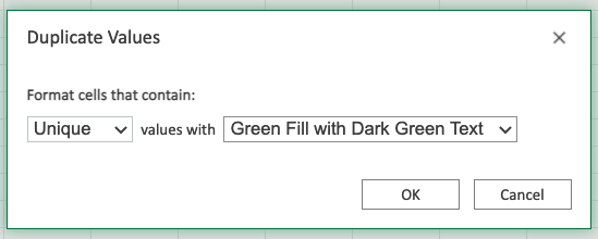 Duplicate Values.. is one of the options for the condition, and can check for both duplicate and unique values.
