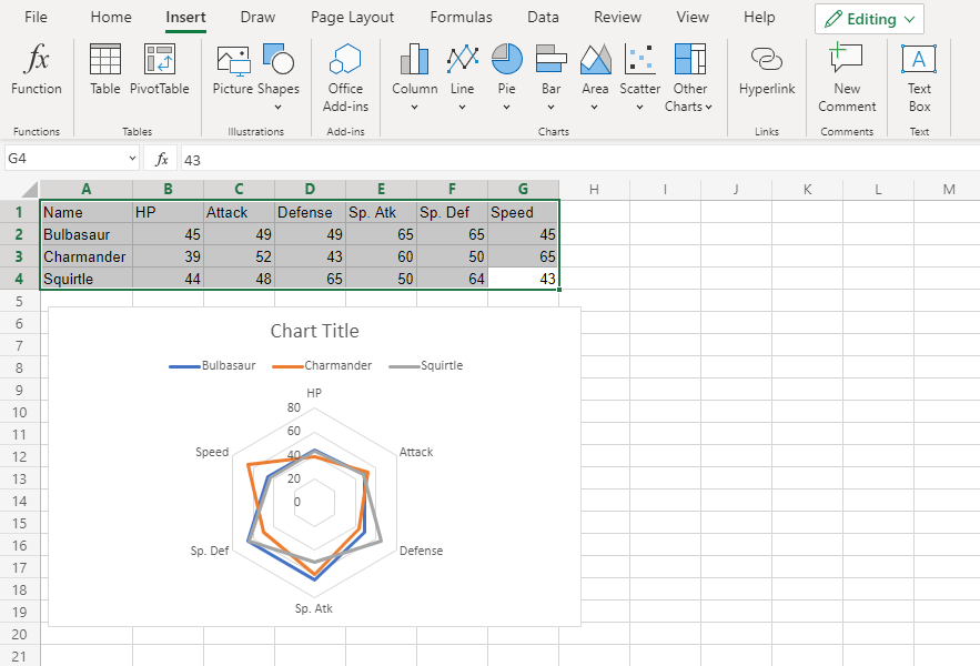 The chart shows that Charmander has the highest speed and lowest special defense. Squirtle has the highest defense and lowest special attack. The three Pokemon have similar HP and attack stats.