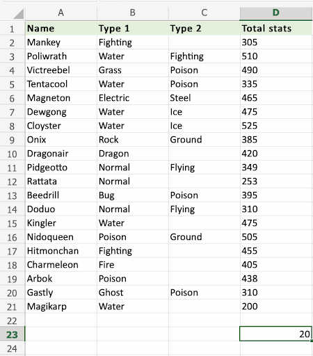 Apply the =COUNT function to range D2:D21. Counting the cells of Pokemon Total stats, which is numbers only: