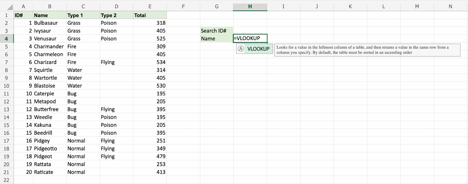 Have a look at that! The VLOOKUP function has successfully found the Pokemon Squirtle which has the ID# 7.