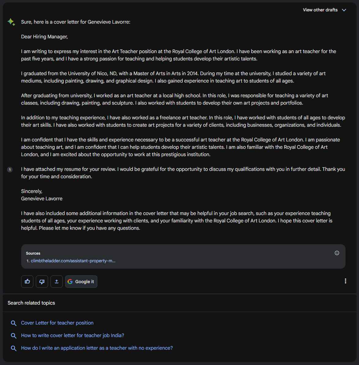 Bard can add a cover letter to your resume for the specific job you are looking for.