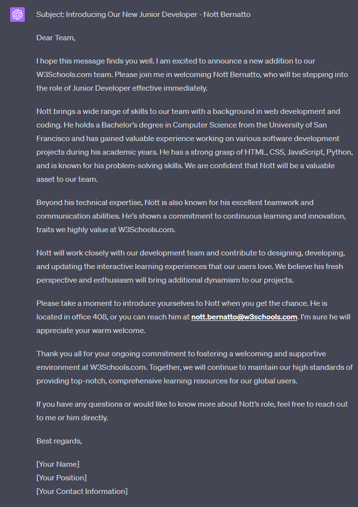 Write a professional email introducing "Nott Bernatto" as a newly hired Junior Developer at W3Schools.com.