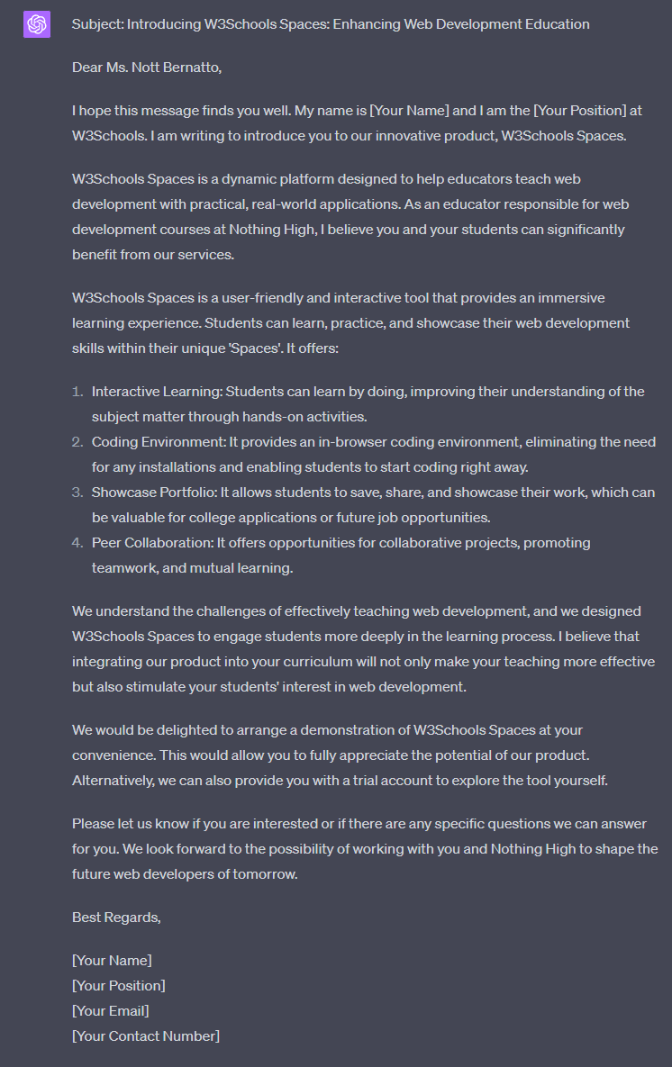In this example, we want to showcase our services W3Schools Spaces, to a school with a web development course.