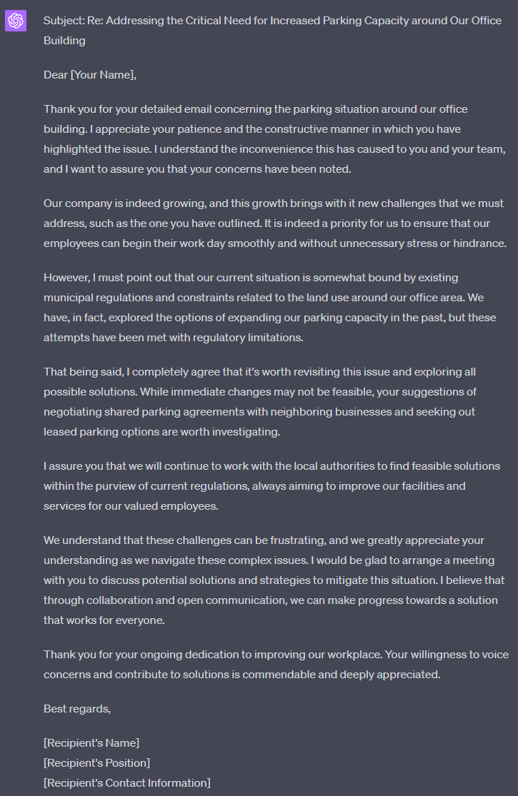 In this example, we respond to the complaint above that though the parking situation could be better, it is the best we can do with the current regulations.