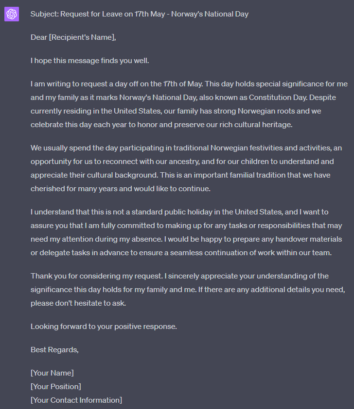 Write a professional email requesting the day of the 17th of May? This is Norway's national day, and though we understand that this is not usually a day off in the USA, we want to respect our Norwegian heritage with our family.