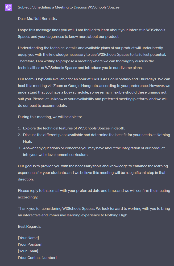 Write a professional email requesting a meeting for a discussion about using the product "W3Schools Spaces" (detailed here "https://www.w3schools.com/spaces/" ). The client has expressed interest and wants to know more about the product. The subject of the meeting is going through technical details and available plans. The client's name is "Nott Bernatto", and she is in charge of the web development course at "Nothing High", a high school in New York. We are typically available for an hour at 16:00 GMT on Mondays and Thursdays via Zoom or Google Hangouts but are flexible if that does not work for the client.