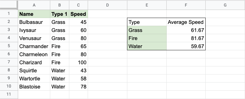 The function now calculates the average speed value of the Grass type Pokemon: Bulbasaur, Ivysaur and Venusaur.