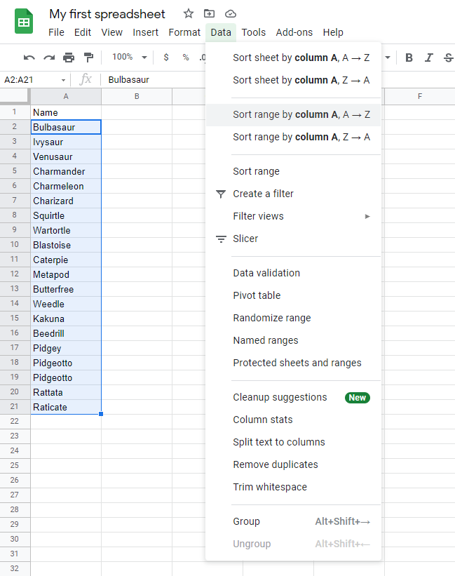 Sort the Pokemon in the range A2:A21 by their Name, ascending from smallest to largest (A-Z).