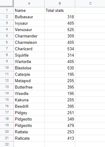 In this example we have two columns with related data. Column A is the Pokemon Names and Column B is their Total stats. Try sorting just one of the columns (A2:A21) ascending by their Names.