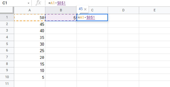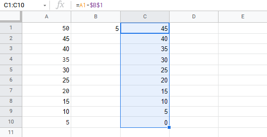 You got it! You have successfully used absolute reference to subtract B1(5) from the minuend range A1:A10.