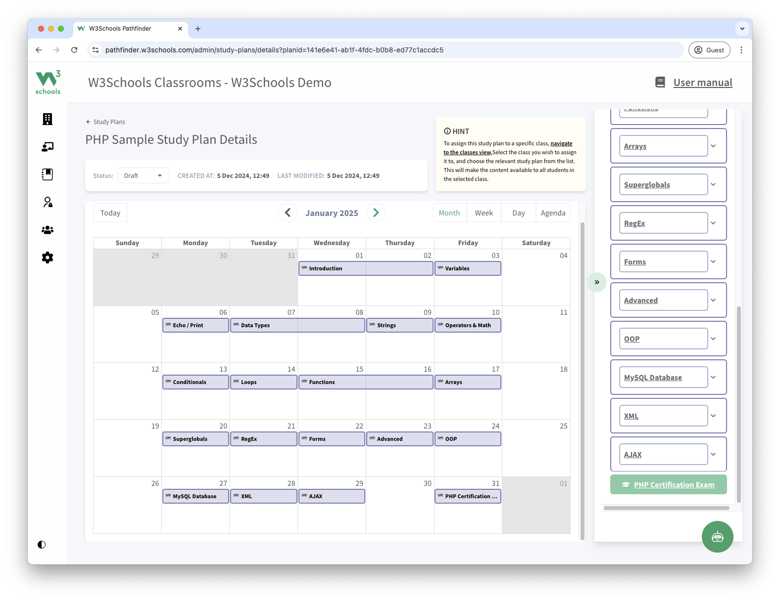 This study plan is a feature of W3Schools Academy.