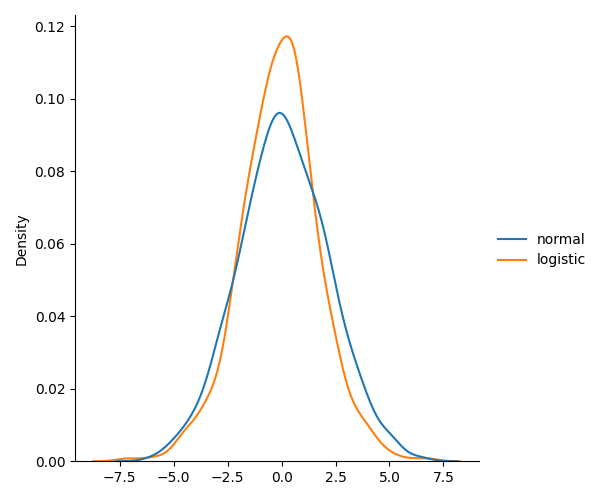 Both distributions are near identical, but logistic distribution has more area under the tails, meaning it represents more possibility of occurrence of an event further away from mean.