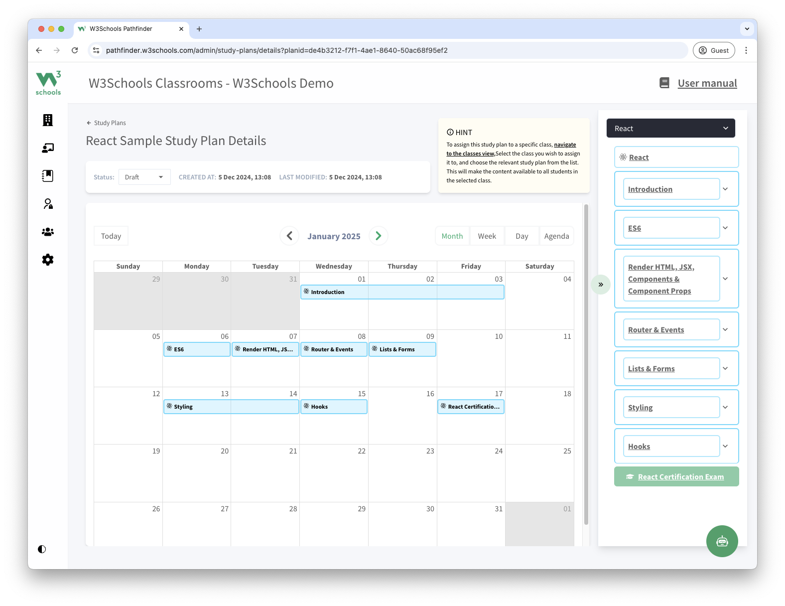 Save time with pre-built teacher materials and study plans. Easily organize your class with a timeline from the introduction of React to the final exam.